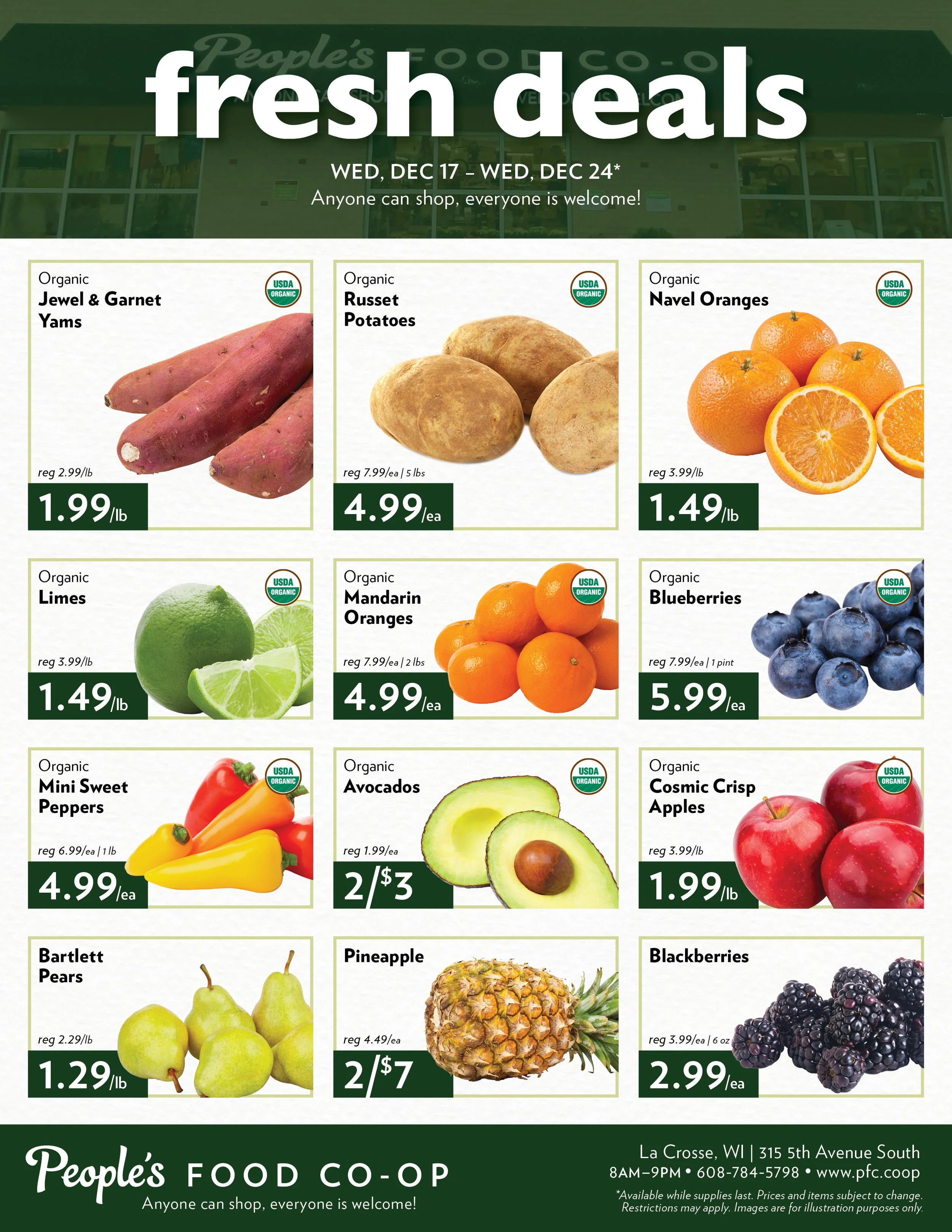 Fresh Deals: La Crosse | December 17-24 Dec 17 Written By Ann Mull We pick the best of the season with a focus on local and organic, and you get the best prices. Get great deals in produce, meat, deli, baked goods, beer, and wine. Shop fresh, shop smart, save money!Click the flyer below to see all the deals! Ann Mull